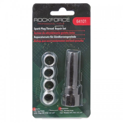 Описание Набор для восстановления свечной резьбы 5 предметов (метчик 14мм, втулки: 3/8", 7/16", 1/2", 3/4"), 937 RF-64101